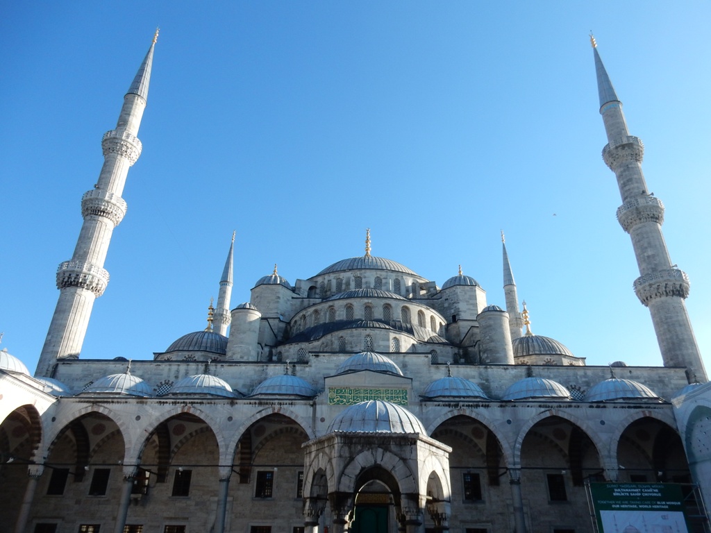 Despite Istanbul being a Christian city in the past, most of the inhabitants are Muslim, which shows in many mosques and on the streets as most women wear head scarves. Sultan Ahmed Mosque or the Blue Mosque was built in the beginning of 17th century in time of Ahmed I, and is the most known mosque in Istanbul. It has six minarets (it is one of the three mosques in Turkey with six minarets), five main domes and eight secondary domes. The legend says that the mosque has six minarets because of a misunderstanding. The sultan supposedly wanted gold minarets and the architect understood it as six minarets because of the similar Turkish words. The mosque is also called the Blue Mosque because of hand-painted blue ceramic tiles. On the opposite side of Blue Mosque, one can find Hagia Sophia or church of holy wisdom with a mighty dome. Hagia Sophia was the main mosque of Istanbul until the Blue Mosque was built. Today’s building is the third church built on that site. The first was built in year 360 and would be 200 years older than the building we can see on that site today. Hagia Sophia was the main Christian church in Constantinople from 537 to 1453. It even amazed the Ottomans as they didn’t tear it down after claiming Constantinople as they did with the other buildings. They kept it, added four minarets to call the worshippers to pray and turned it into a mosque. Once a mighty Christian church, which used to be a model for many mosques, is a museum from 1935. Hagia Sophia is today one of the most visited attractions in Istanbul, mostly because of many mosaics, which represent Mary, Jesus, saints, and emperors. The mosaics go back to 8th century, which means that some are even 1000 years old but they are well preserved, as they’ve been hiding under plaster from 1453 to 1931 when the building served as a mosque and Koran bans any depiction of people or animals.