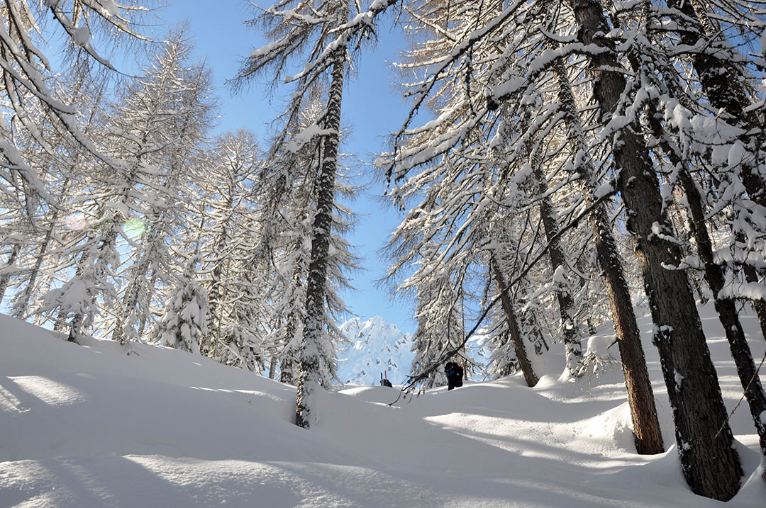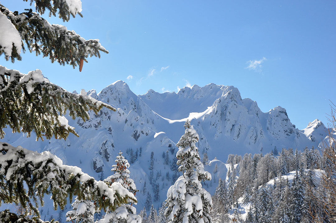 The mountain of Svete Višarje is very popular for tour skiers. And although there’s a cable cart leading up (as the mountain has regular ski slopes) many tour skiers head up on foot. The way up is not really arranged. But the marked paths have many more tour skiers on them than they do other hikers. And everybody chooses their own way down for skiing (on paths, ways or even through the forest). The number of visitors even raises, where the avalanche alerts are given. It’s due to the fact that the danger is much smaller here – but you can still reach a tall view point, which usually features a great skiing descent. It would take you some two and half hours to get to the top and you can even get down in twenty minutes.