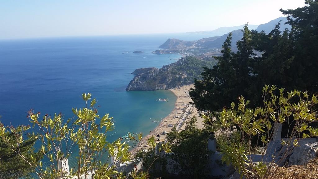 My wish was to climb up to the island’s highest peak, the 1215 metres high Mount Attavyros. The path led us to the western part of the island, through typical Greek villages of Archipoli, Eleousa, Platania, Apollona, Embonas, and Attavyros. We found a road section after a few kilometres that lead all the way to the top. The wonderful paved road, however, soon turned into a washed-out dirt road, so we gave up, walked about a bit and, due to inappropriate footwear, abandoned our target. We did scout the terrain for our next visit, though. The path then took us a few kilometres south through the villages of Siana, Monolithos and Apolakkia, and onwards towards the eastern part of the island through the villages of Vati and Gennadi. When we arrived at the eastern Rhodes, we discussed about going for a swim on of the numerous beaches, but later settled on our beach in Stegna.