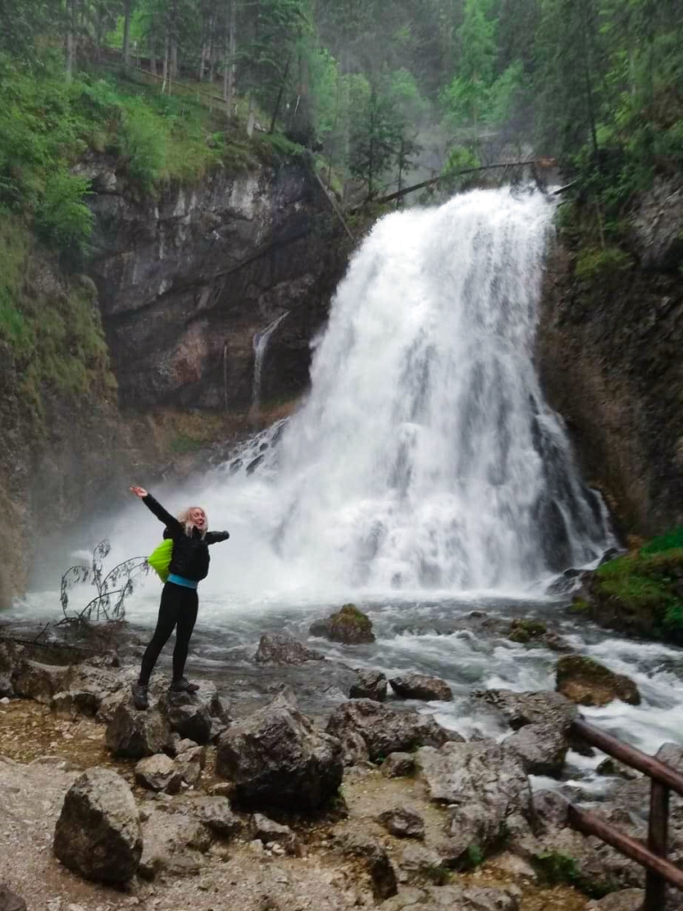 The day still wasn’t over and our train ticket was still valid, not to mention we still had lots of energy. Let’s get moving, then. Next station – Golling. The tourist sign indicated a waterfall there. We had to make a choice, it was getting kind of dark, and the waterfall wasn’t exactly right behind the corner. Still, we decided it was worth taking the risk and hurried up. Rain was threatening along the way, though that hadn’t been anything unusual in the last couple of days. We let Google give us at least some general guidance, just in case, and we also noticed the opening hours for the entry to the waterfall. By our calculations, we’d be there only after the gates were already closed. Still, we tried. When we finally got there, there was no one in sight and the barrier was lifted, so we could still make our way to the majestic Golling Falls. Thanks to the gloomy weather, the waterfall was even more majestic than in the photos.
