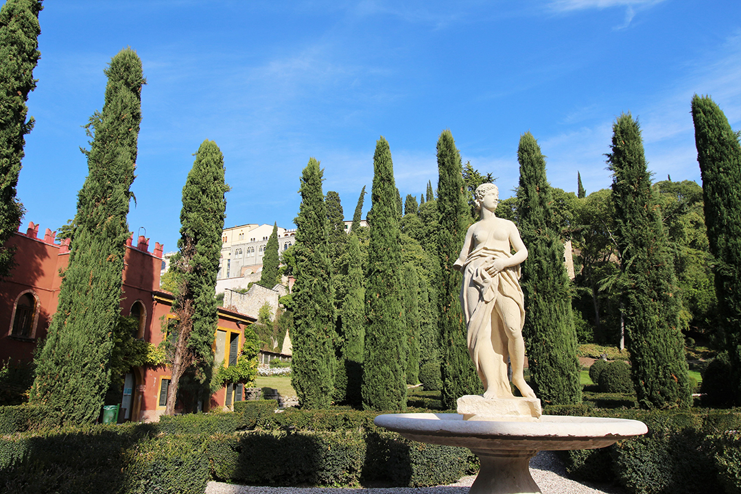 We began our trip to Verona by visiting the park of the Giusti family. The beautiful 16th-century Italian Renaissance garden is located between the Adige and the hill. It’s a green oasis in the middle of the city, full of ancient trees, bushes, cypresses, statues and labyrinths. There are nice pathways running between cypresses. We climbed the steps to the upper deck from where you can enjoy a wonderful view of the city.