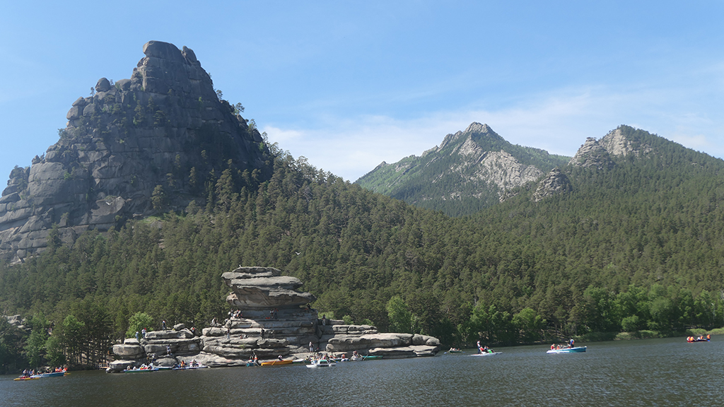 After an hour’s bus ride through an endless and dense forest of pine trees – and only pine trees, as I couldn’t see any other plants – it became clear to me where the place got its name. You can feel the smell of the “sea” in the air and it already feels more like summer. I’m enjoying the Kazakhstani “seaside” in late May, yay! I head to the lake and find a two-hour boat tour of the lake. Okay then, let’s do some sightseeing. In the company of a Russian family, I embark on a boat ride. There’s beautiful nature all around us with very peculiar mountains and, of course, the forest. Everyone’s relaxed and there’s Russian music blaring on the boat – really like going back to the Soviet times.