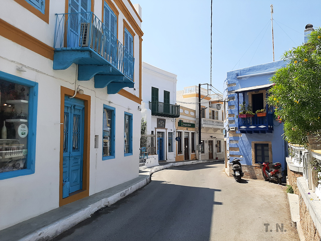 Somewhere in the middle of my stay at the camp, I took the afternoon off and walked from the town of Lakki to the place where I originally disembarked on the island, at Agia Marina. On the way to the town I stopped at Pandeli beach, which, unlike the others, is full of tourists and also has one of the best restaurants on the island - El Greco (of course, the owners know Panos well) and the Harris bar (they also know him here) above the beach, which is located in the first of the five windmills that once ground wheat, barley, etc., and are now one of the most photographed attractions in Greece.