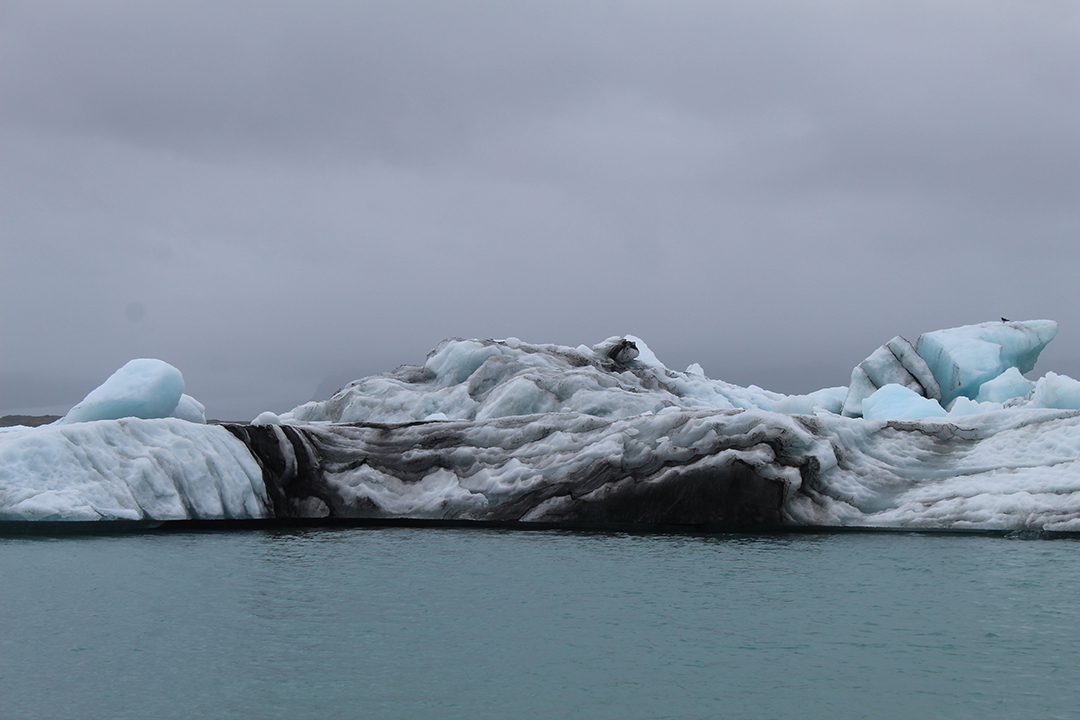 I’m standing next to Jökulsárlón – a glacier lagoon. I connect with the present, turn on all my senses and fall into some kind of meditative state, although being fully conscious. I smell the freshness of the ice. I feel the coldness on my skin, the raindrops. I hear the ice moving on the water. All of a sudden, I hear a loud crack. It startles me. A large chunk of ice that I’m observing, swayed and broke in half, one part falling into the water. The sound I can’t describe is so deep and so new to me. I observe all these colours, these various hues that encompass everything, from white and gentle blue to blue-green, turquoise and then grey and black. All these structures and patterns. All this ice I see now that will soon cease to exist. I walk to the water and touch it. I’m not cold at all, it’s rather invigorating.