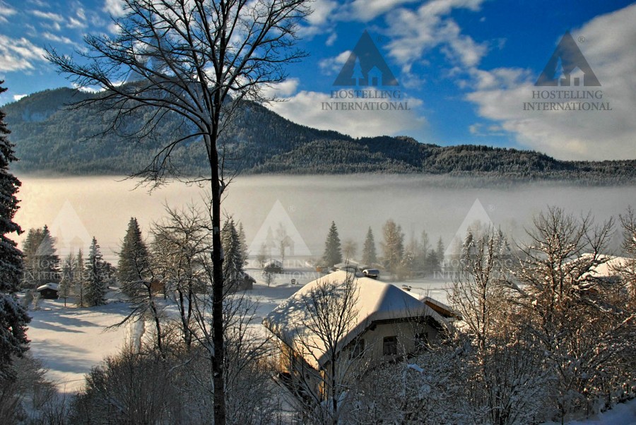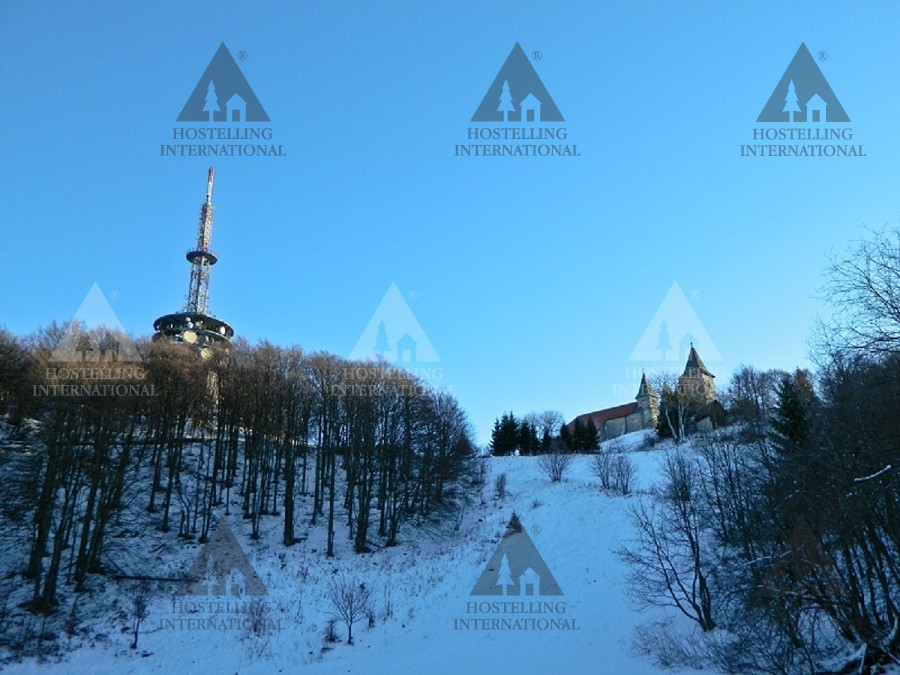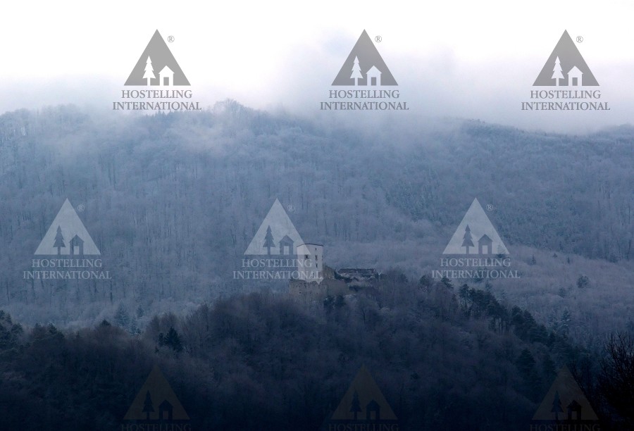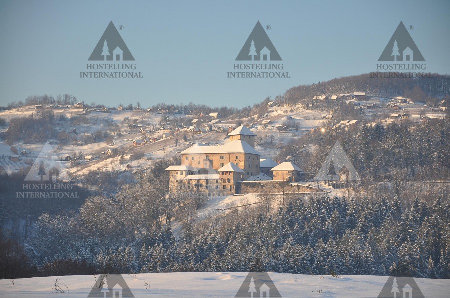 Grad na zasneženem hribu, ovit v meglice, dobi pridih pravljičnosti.