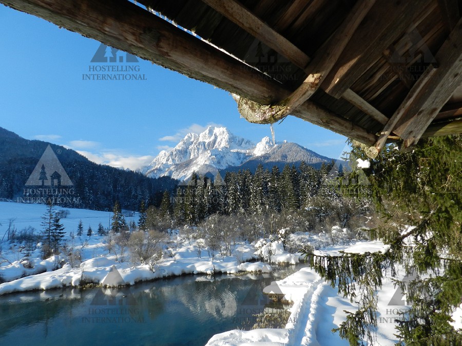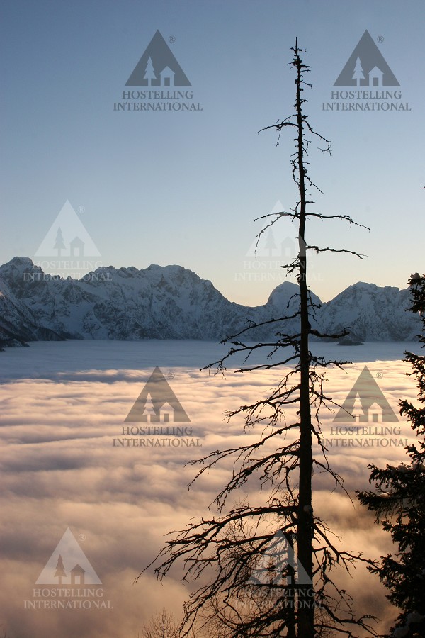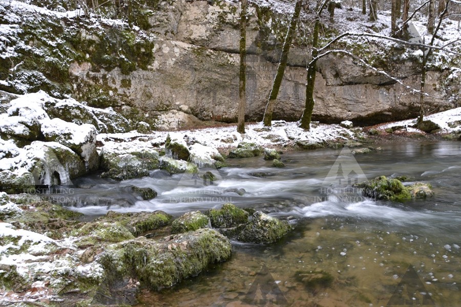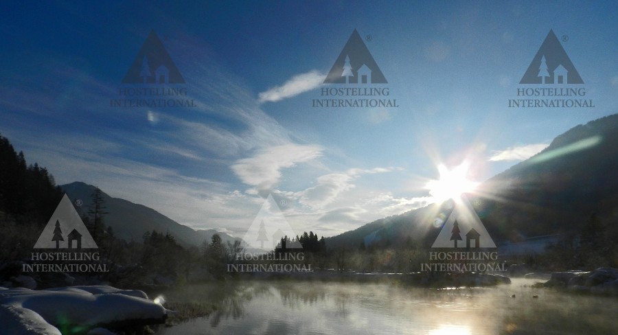 pogled v smeri proti Podkorenu ob pol osmih zjutraj ob sončnem vzhodu. Nad izvirsko vodo vstajajo meglice izza Vitranca pa se že kažejo jutranji žarki zimskega sonca.