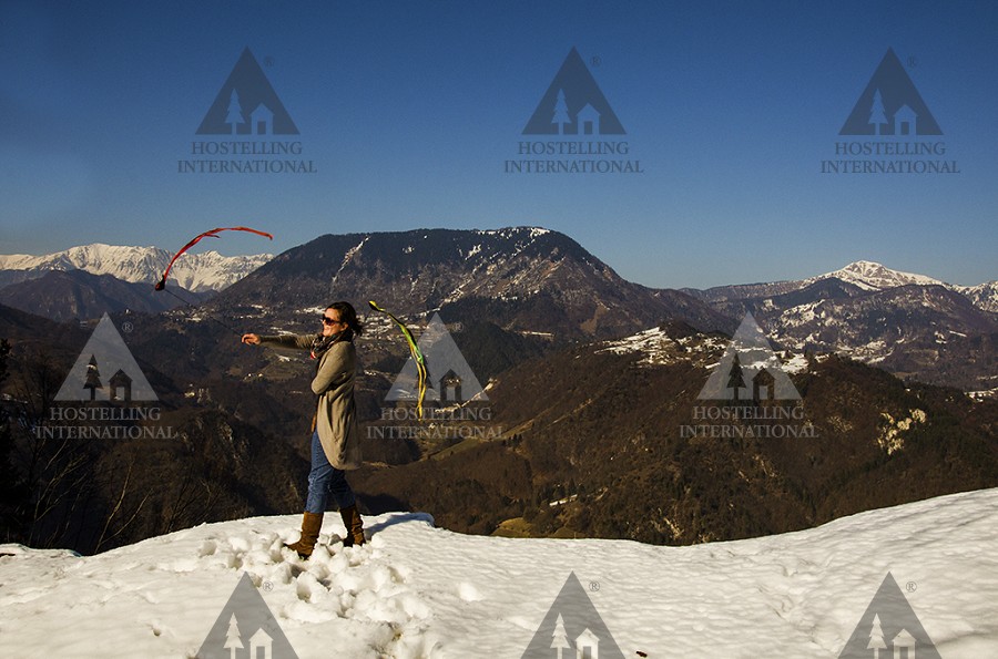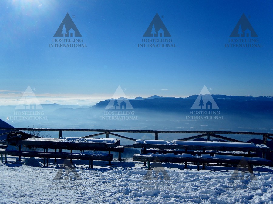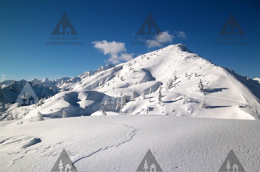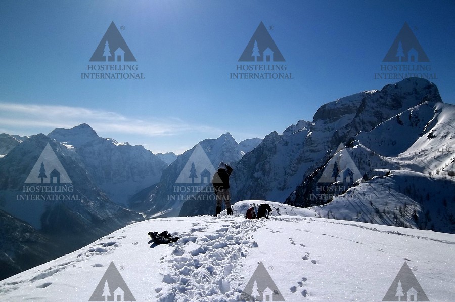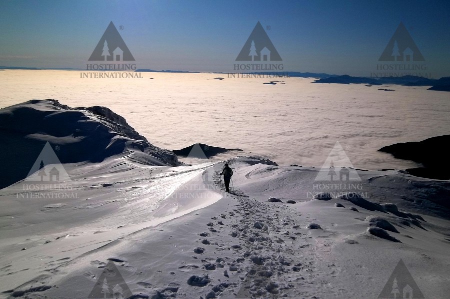 Hija iz vrha Kalškega grebena v dolino, na topel, zimski, sončen dan.